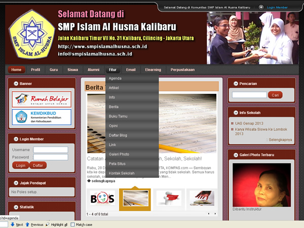 Dibawah ini saya tampilkan screenshot website sekolah yang sudah saya buat sebagai contoh website sekolah atau contoh web sekolah yang telah mengikuti layanan pembuatan website sekolah gratis ini. Silahkan anda lihat contoh web sekolah dibawah ini untuk meyakinkan anda bahwa website sekolah yang nanti saya siapkan untuk anda sesuai dengan kebutuhan sekolah. Untuk melihat daftar sekolah yang mengikuti layanan ini silahkan klik link berikut , Daftar Sekolah Peserta Website Sekolah Gratis.